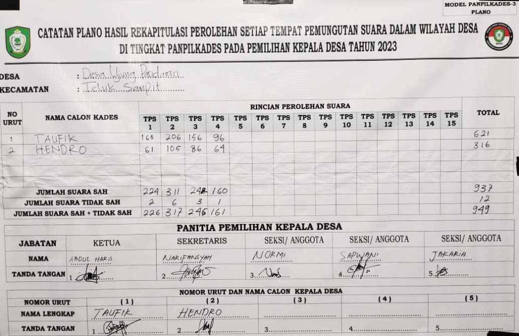 Hasil Rekapitulasi Sementara Pilkades Desa Ujung Pandaran dan Desa Basawang Kecamatan Teluk Sampit
